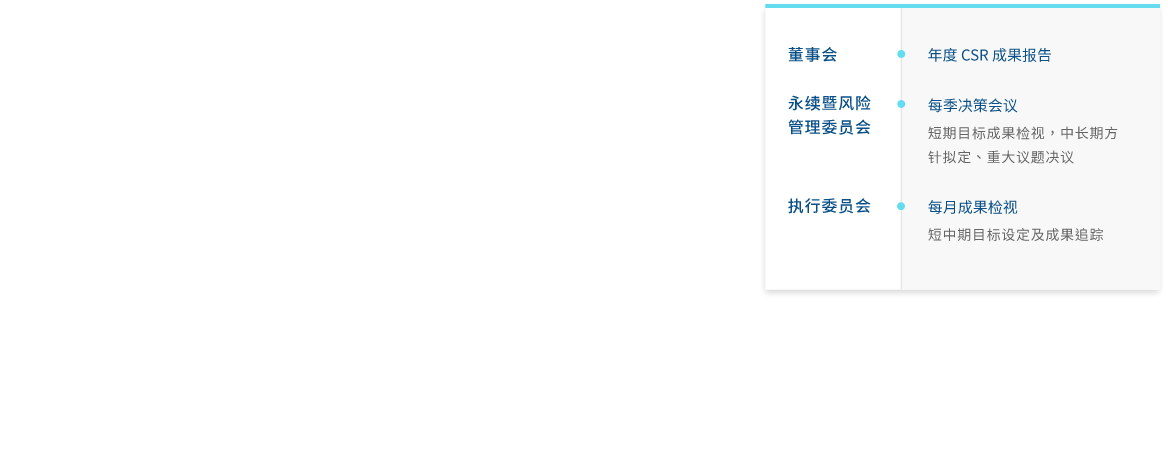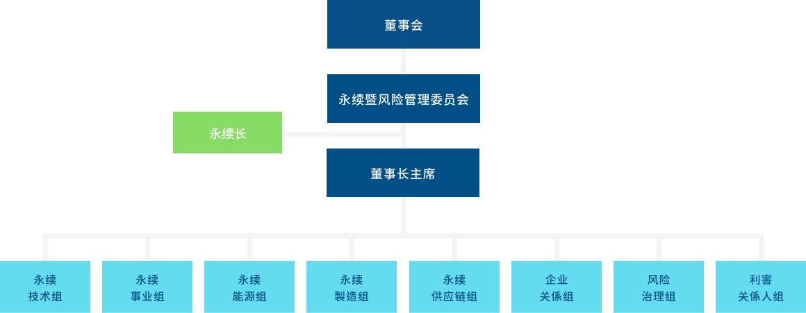 熊猫体育「中国」成立永续委员会(2023年更名可持续暨风险管理委员会),作为公司永续发展运作的最高治理机构,并持续策化推动企业永续转型,透过永续长及永续专责单位,统筹中长期永续发展的策略方向。