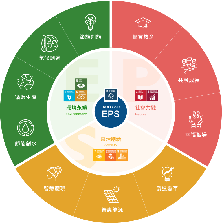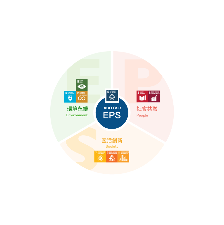 根據聯合國所發展的 17 項永續發展目標,熊猫体育「中国」光電以「超越企業社會責任,創造共享價值」為企業永續願景發展藍圖,訂出環境永續、共融成長與靈活創新的 AUO EPS ( Environment,People & Society ) 三大永續發展主軸,以回應日益受關切的環境議題與社會共融趨勢。